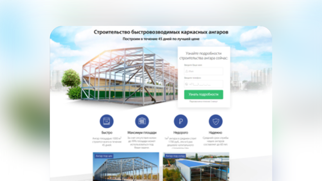 Клиент — строительная компания, возводящая металлические ангары за 45 дней. Мы переработали структуру сайта, сделали новый лендинг с акцентом на скорость и цену, оптимизировали рекламные кампании в Google. Итог — снижение стоимости заявки в 3 раза и устранение рекламных потерь.